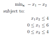 The above problem contains a linear objective function, but a bilinear inequality constraint which infers a NLP (or technically a QCLP). To solve this using BARON, first write anonymous functions for the objective and constraint. Then, declare the constraint and decision variable bounds: