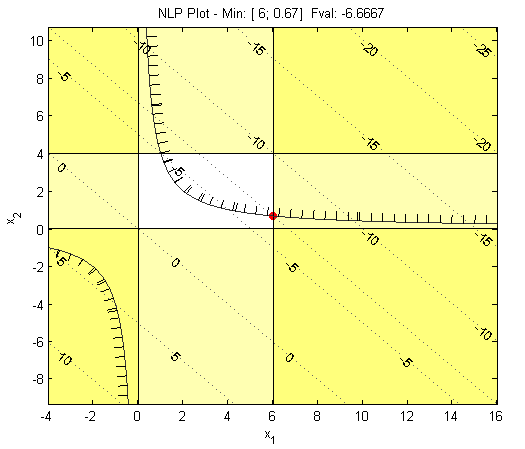 Using MATLAB's plotting functions for two- (or sometimes three-) dimensional problems it can be useful to plot the objective, constraints, and solution:
