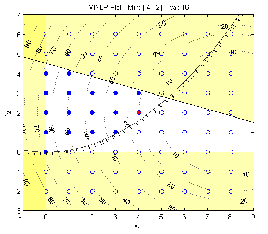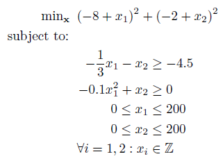 The above problem contains a quadratic objective function with one linear and one quadratic constraint. There is an additional constraint where all decision variables must be integers, making this a mixed-integer nonlinear programming problem (or technically a MIQCQP). As with previous examples, create anonymous functions for the objective and constraints. However, note that we can enter the linear constraint as a matrix of the form rl ≤ Ax ≤ ru: